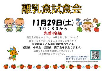 イベント公開日:2025年11月13日地域交流「離乳食試食会」のお知らせ開催日:2025年11月29日(土)