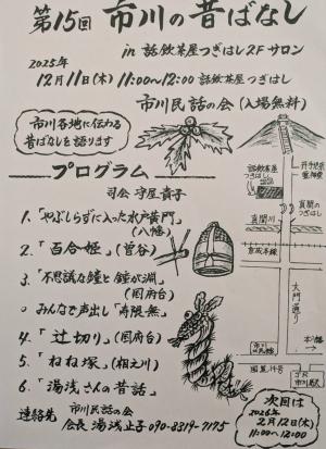 開催日:2025年10月25日(土)<br>開催時間:14:00~15:30<br>市川民話の会は、市川に伝わる民話を次世代に残していこうと、<br /> 毎年「市川の民話のつどい」を開催していま...