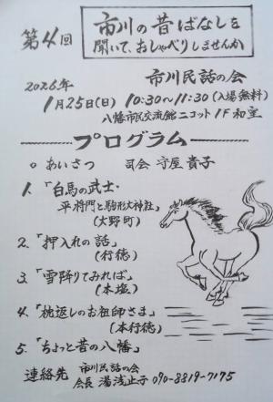 開催日:2026年01月25日(日)<br>開催時間:10:30~11:30<br>第4回 市川の昔ばなしを聞いて、おしゃべりしませんか<br /> <br /> 2026年1月25日(日) 10:30~11...