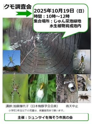 開催日:2025年10月19日(日)<br>開催時間:10:00-12:00<br>『クモ調査会』<br /> 集合場所:じゅん菜池緑地 水生植物育成池内<br /> 講師:加藤輝代子氏(日本蜘蛛学会会員)<br /> ...