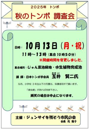 開催日:2025年10月13日(月)<br>開催時間:11:00-13:00<br>秋のトンボ調査会<br /> <br /> 日時: 10月13日(月・祝)11時~13時(集合10時50分)<br /> 集合場所:じゅ...