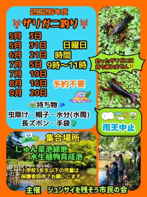 開催日:2026年05月03日(日)<br>開催時間:9:00-11:00<br>2026年度第1回ザリガニ釣りは、5月3日(日)9時~11時です。<br /> ザリガニ釣り<br /> 日程:5月3日(日...