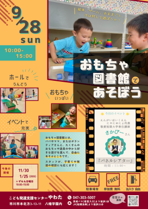 開催日:2025年09月28日(日)<br>開催時間:10:00~15:00<br>6歳までのお子さんとご家族を対象にした親子の遊び場です。申し込み不要・無料です!色々なおもちゃで遊ん...