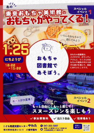 開催日:2026年01月25日(日)<br>開催時間:10:00~15:00<br>6歳までのお子さんとご家族を対象にした親子の遊び場です。申し込み不要・無料です!色々なおもちゃで自由...